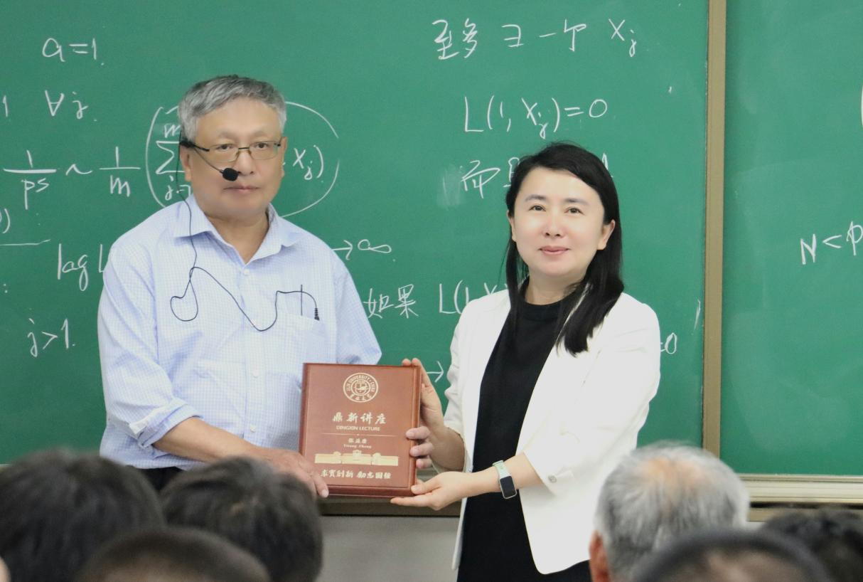 8月27日下午,著名华人数学家、中山大学香港高等研究院应用数学研究中心首席科学家张益唐教授做客吉林大学鼎新讲座,为师生带来题为“The Landau-Siegel Zero Problem:History and Recent Progress”(朗道-西格尔零点问题的历史与最新进展)的学术报告。吉林大学党委常委、副校长张然出席讲座,并为张益唐教授颁发“鼎新讲座”纪念牌。讲座由数学学院副院长生云鹤主持。